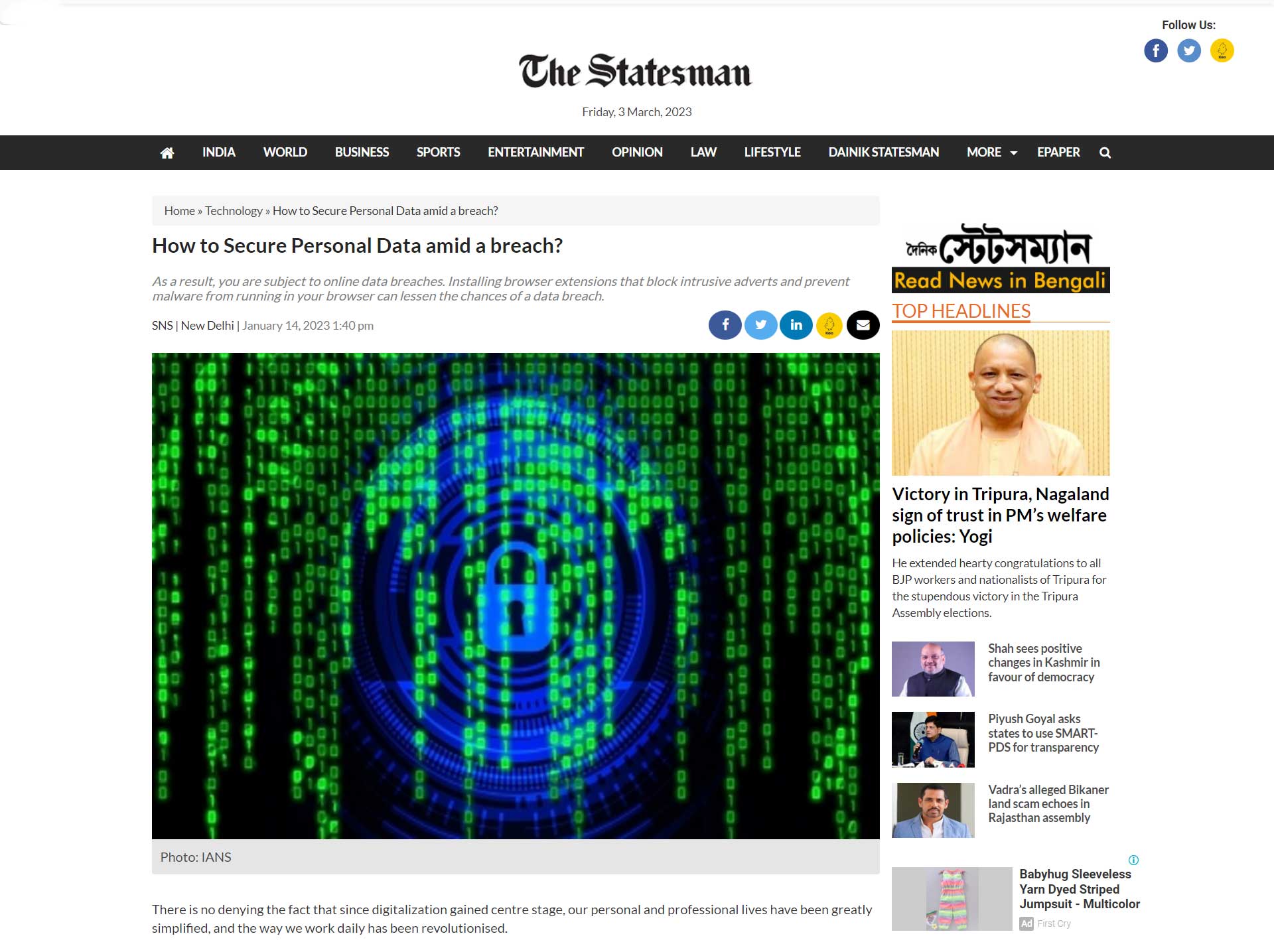 Authored article by Cybersecurity Leader, Mr. Ratan Dargan for The Statesman